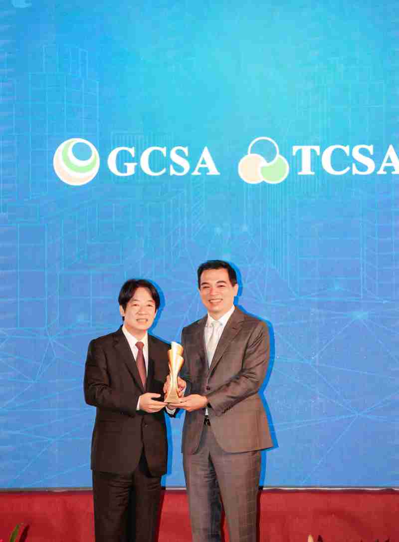 达全方位永续表现获全球永续奖及台湾永续奖肯定,,,由副总统赖清德颁奖 (左),,,红龙扑克总经理柯富仁 (右) 代表领奖