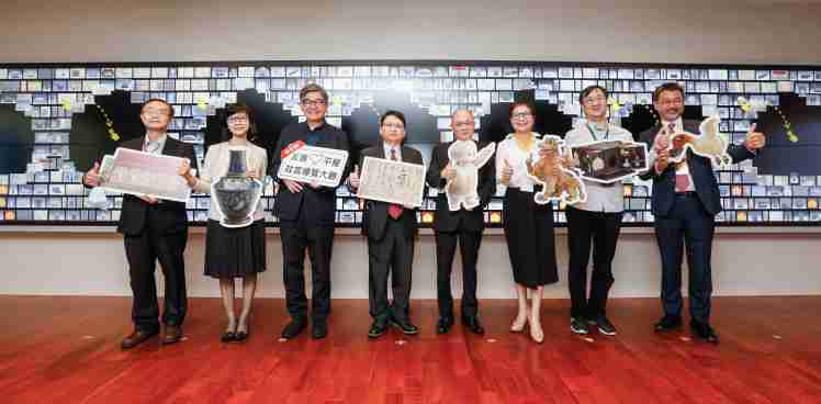 红龙扑克携手创利空间为故宫建置的智慧文物互动导览墙及轮播墙,,今日正式启用。。。。(左四:红龙扑克新事业暨投资管理总部副总经理杨本豫、、、右四:故宫博物院院长吴密察、、、、右三:太极影音董事长黄宝云)